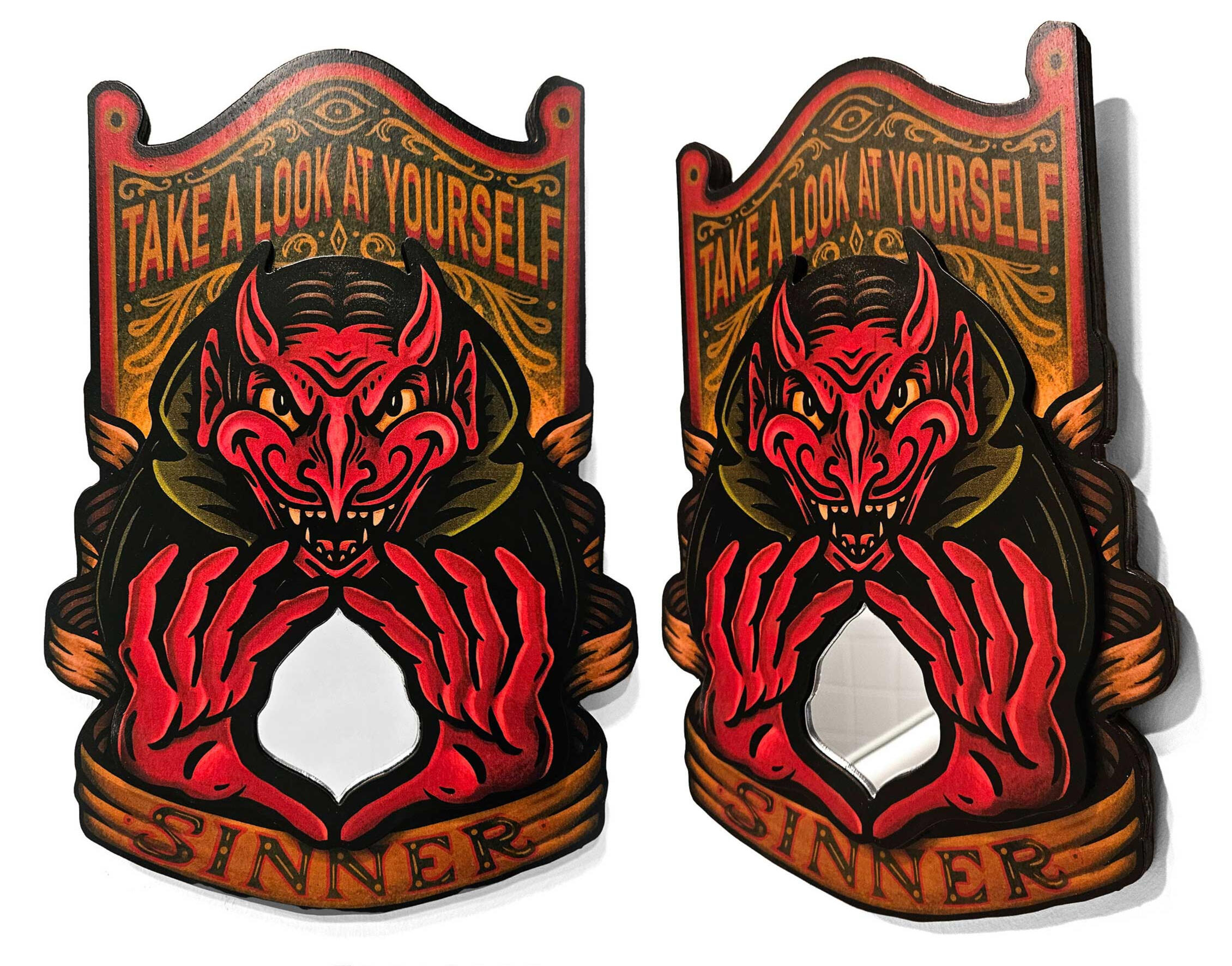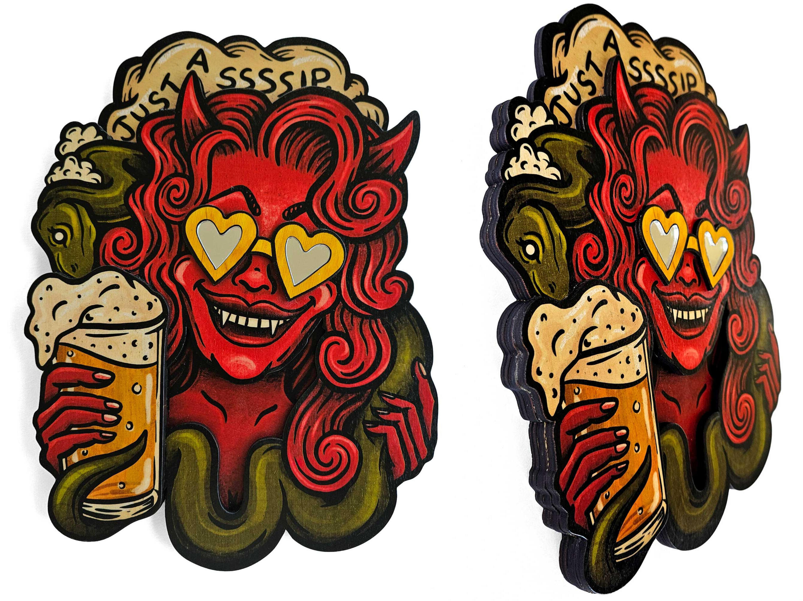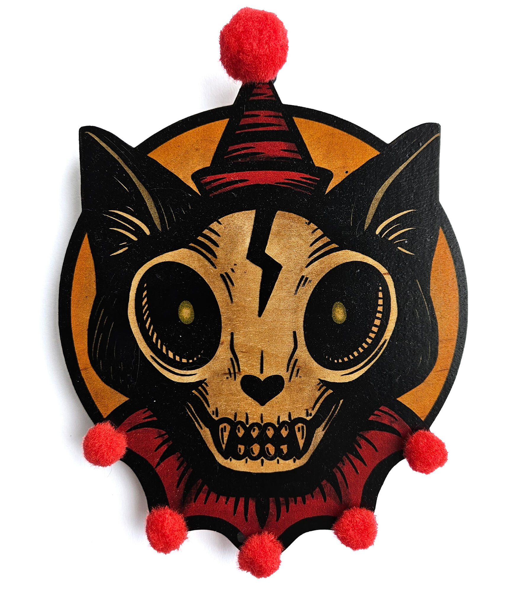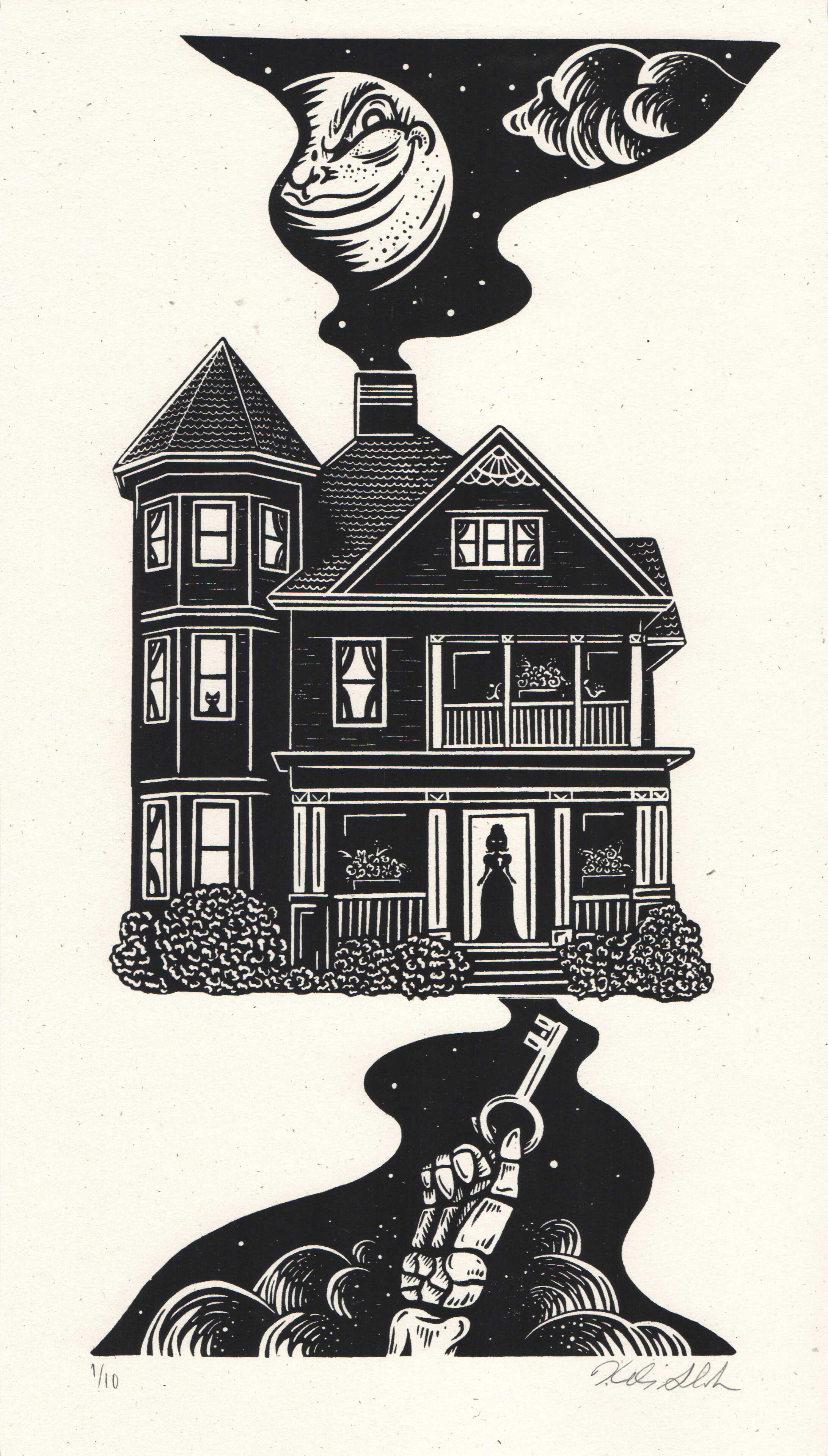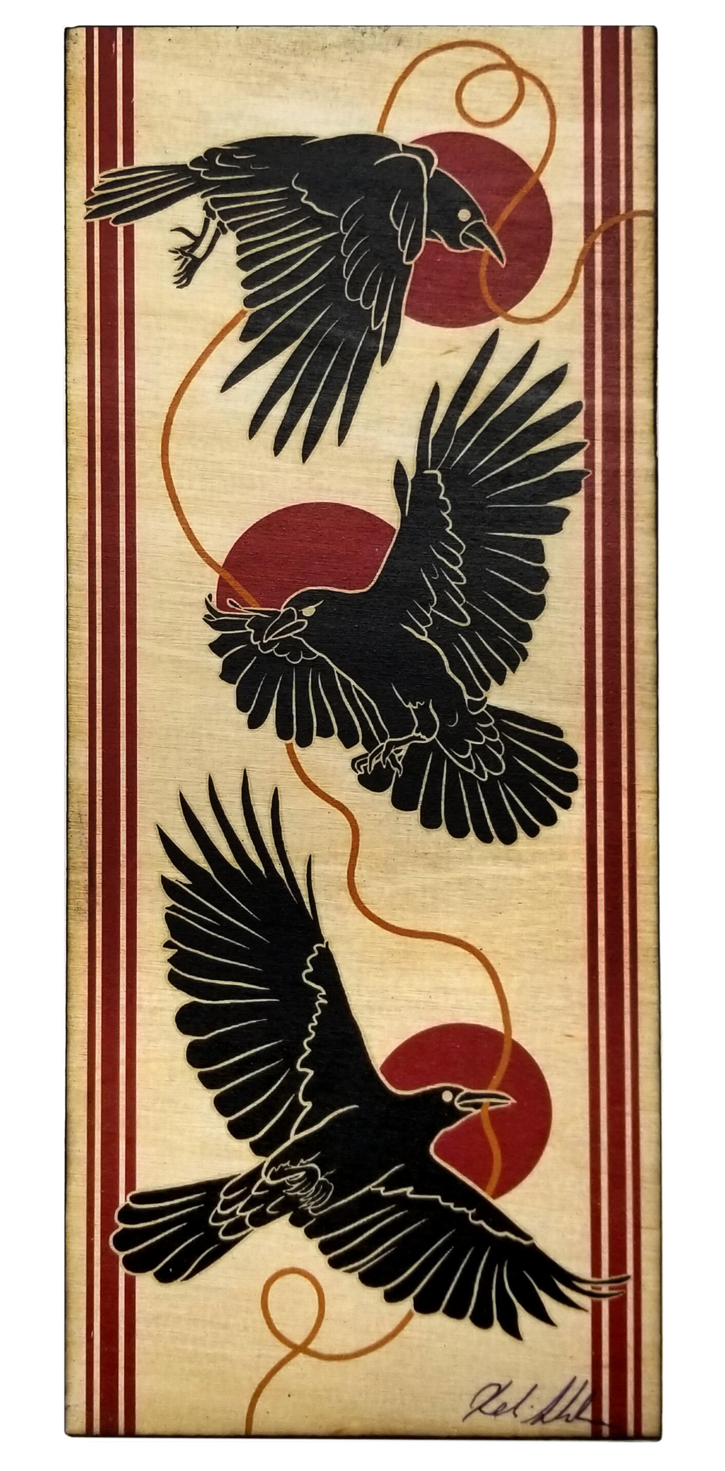 Parlor Trick Prints LLC is my online and traveling company focused on dark, yet whimsical home decor and apparel. My digitally illustrated designs are translated onto clothing, wooden wall art, and other merchandise using an inkjet (DTG) printer and CO2 laser. This method allows me to create unique, affordable objects for customers at local craft fairs, tattoo expos and festivals in addition to my hand-pulled printmaking works on paper. Everything is made in-house. The natural wood grain of each wall piece makes each piece unique.
