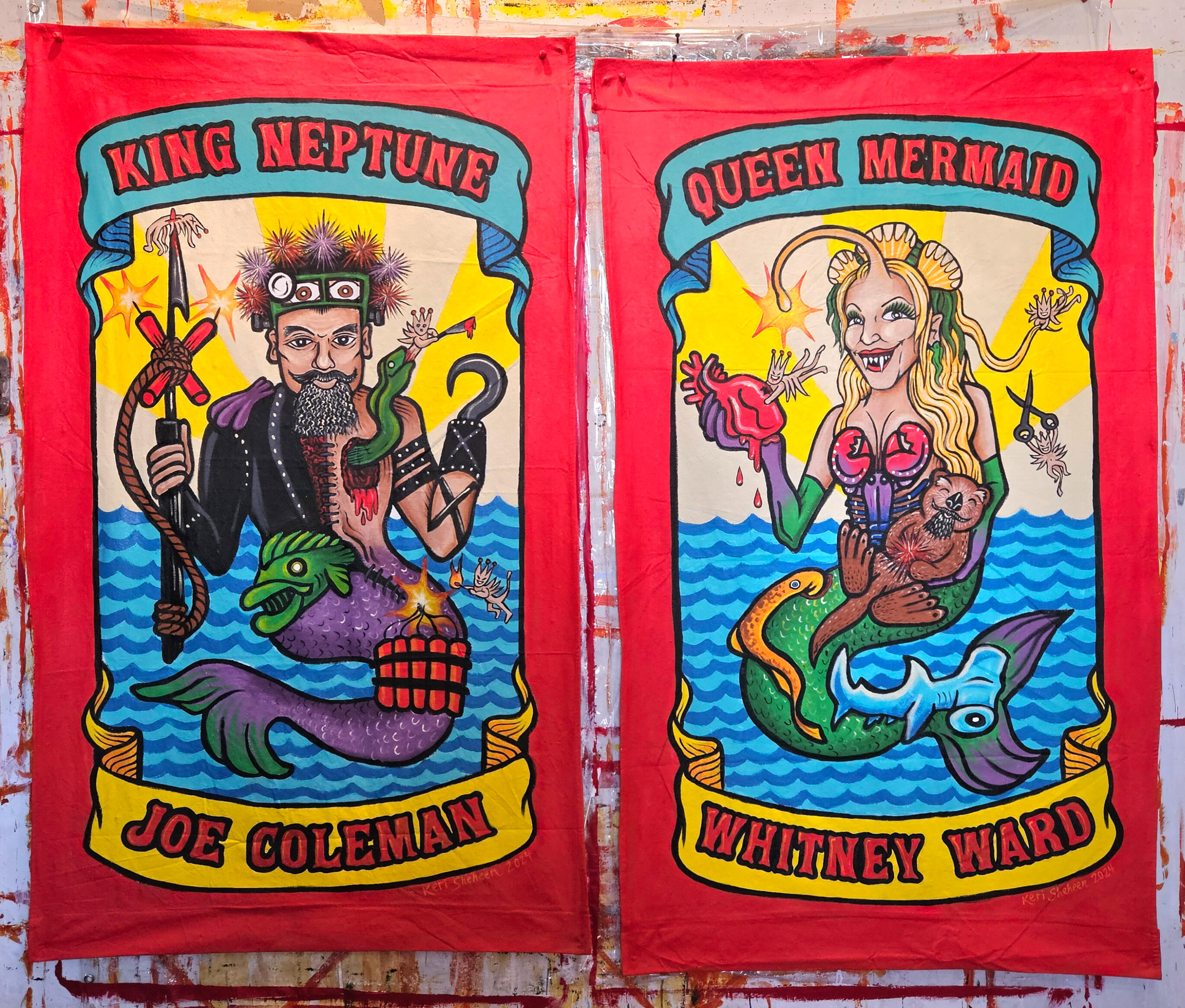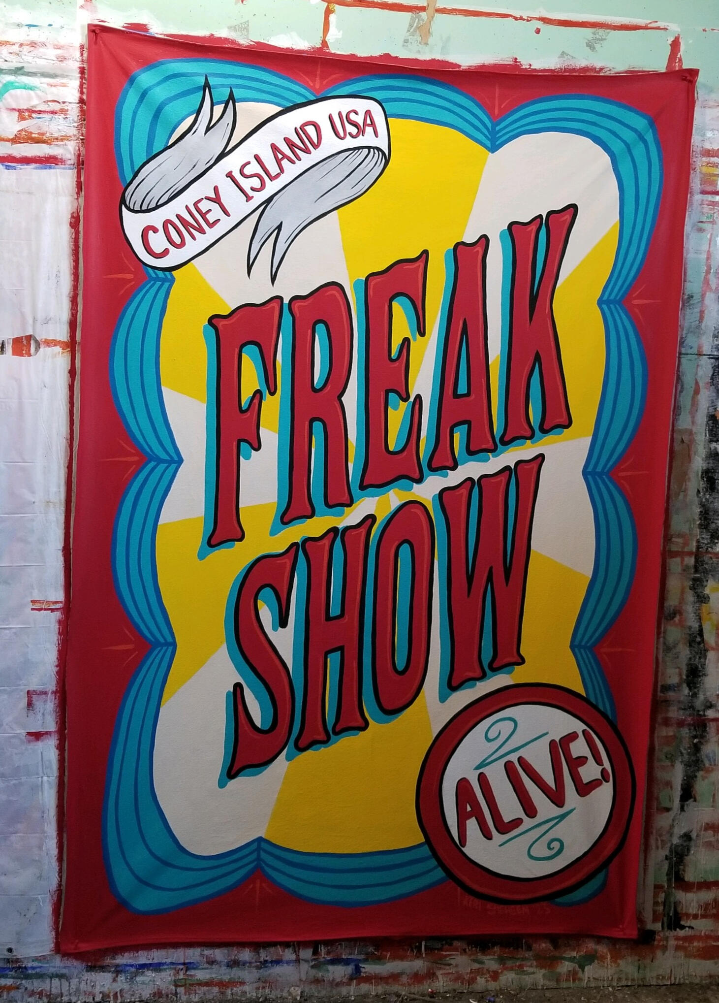 I've had the privilege to work with Coney Island USA over the years and keep the hand-painted sideshow banner tradition alive. I've also designed the logo and parade banner for Coney Island Clown Skool an organization committed to clowning around like a professional. To see more hand-painted banners, check out the Mermaid Parade page.