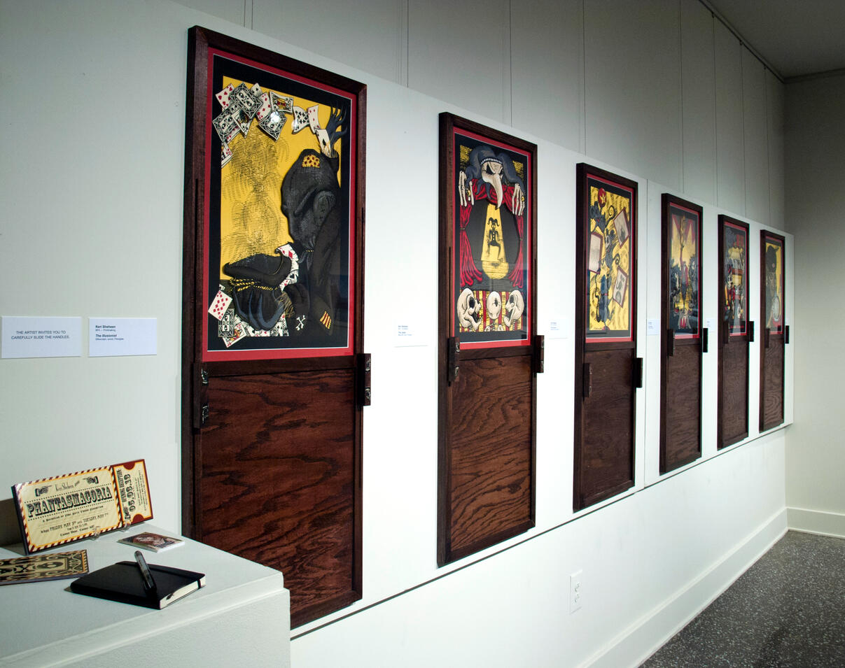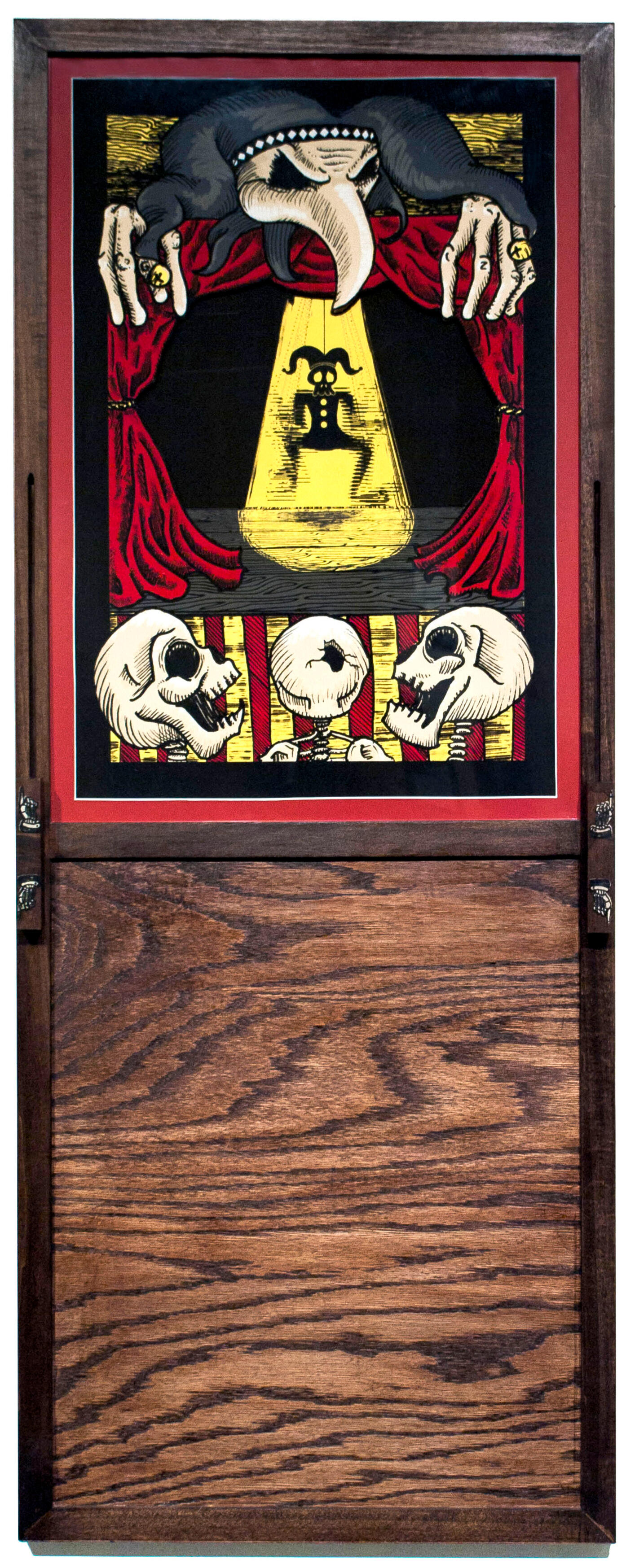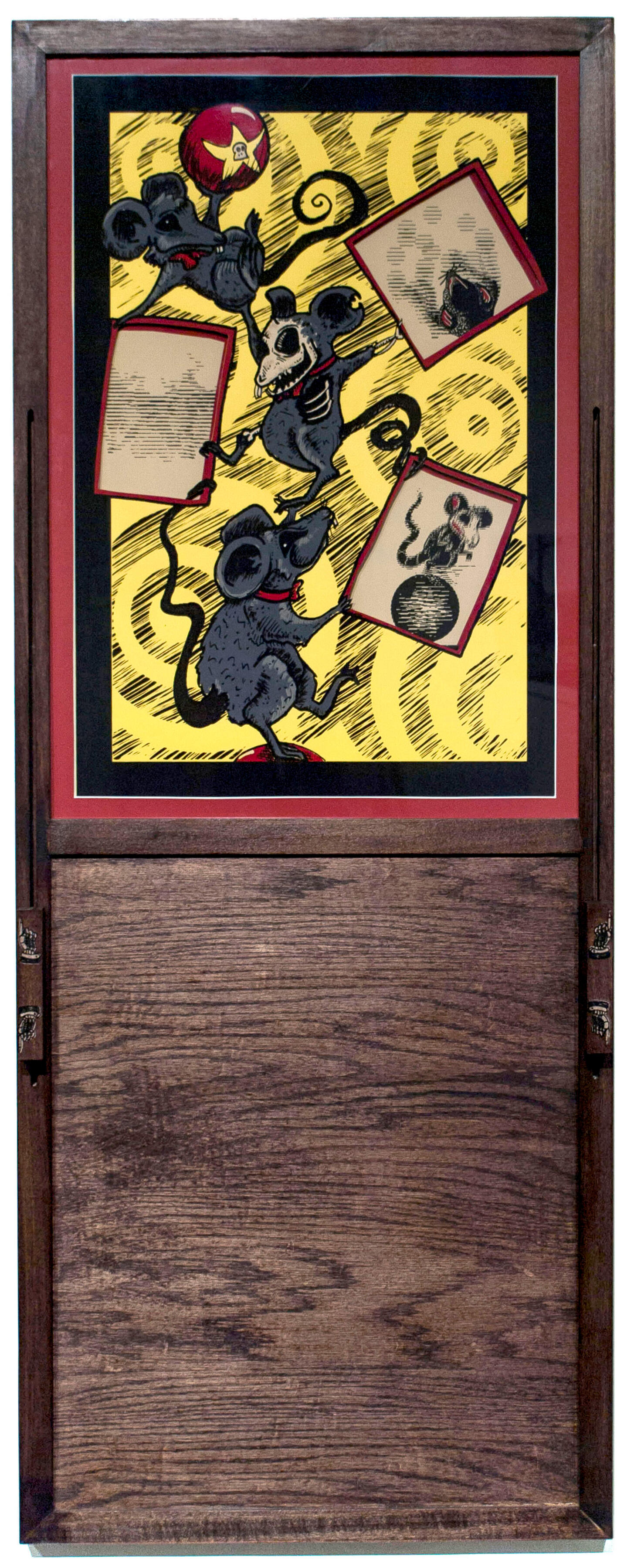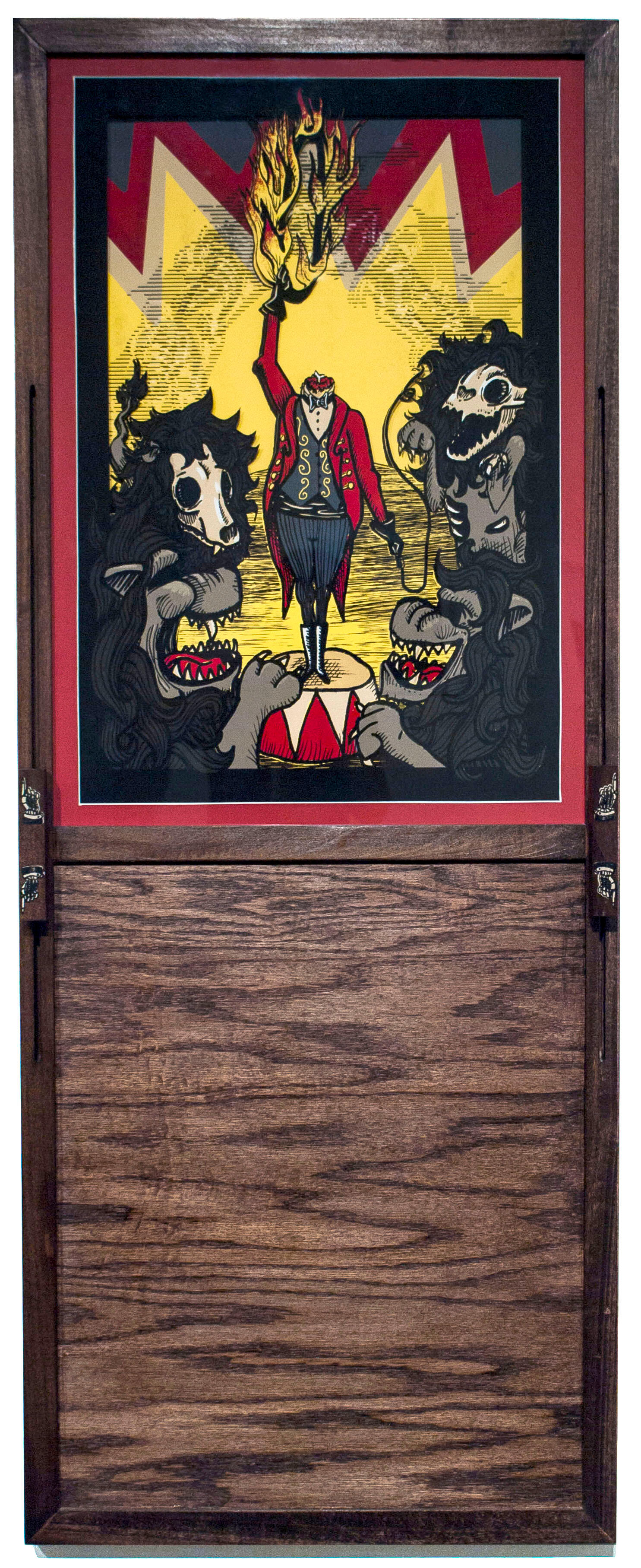Phantasmagoria is an exploration of serigraph prints that exceed the confines of a 2-dimensional plane. My childhood interests of art, cinema, and optical illusions resurfaced to create a series of six interactive, animated prints that come to life with the help of the viewer’s touch. Each piece was crafted with screen printed posters, plexiglass, and wood. These works were on display at the Dorsky Museum of Art in New Paltz, NY in 2013.