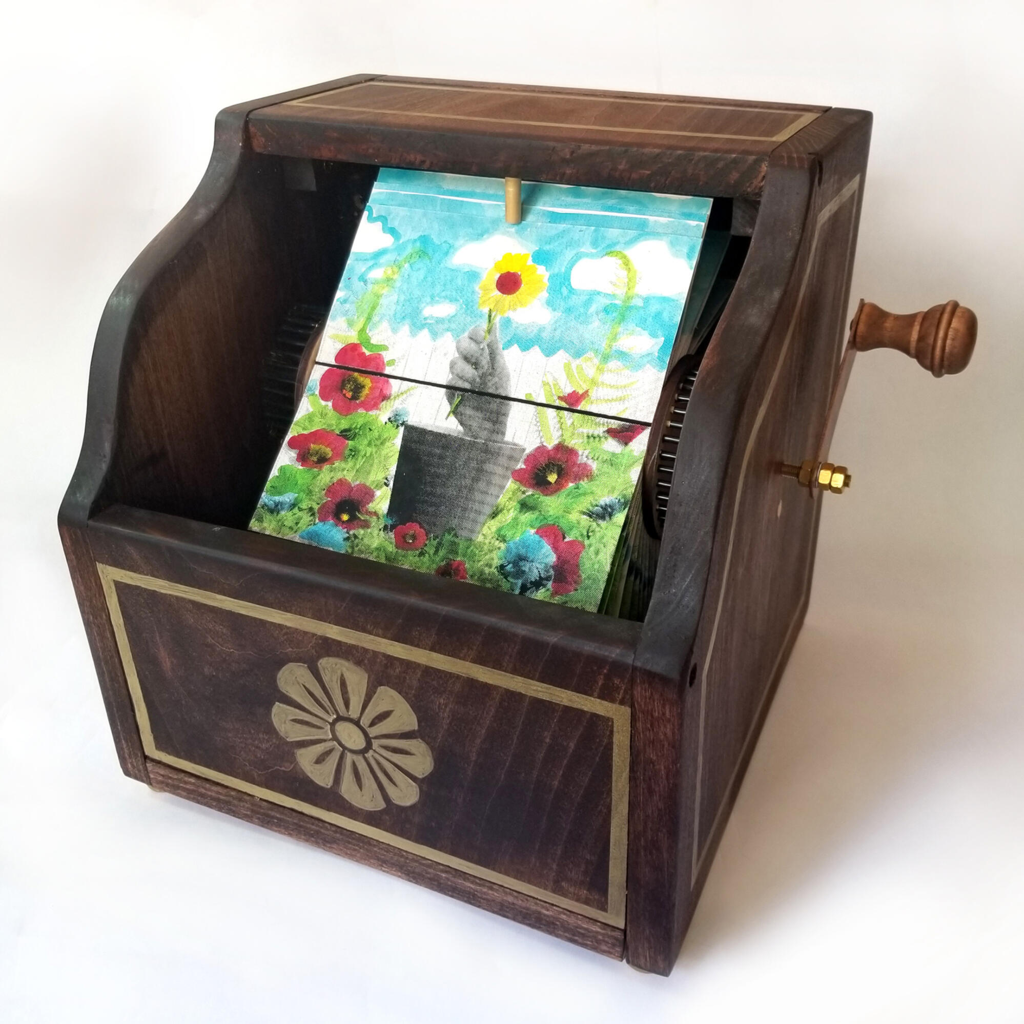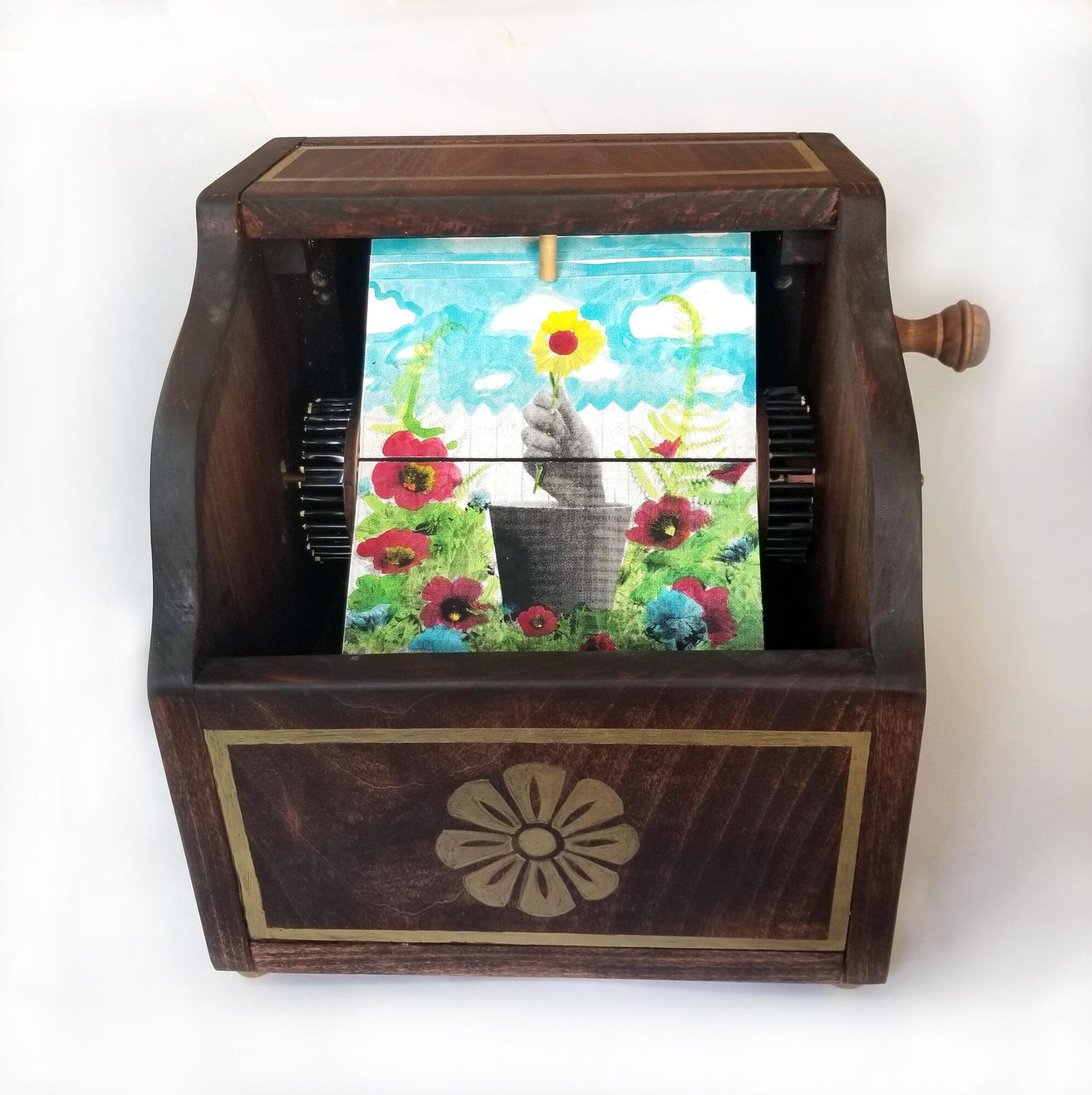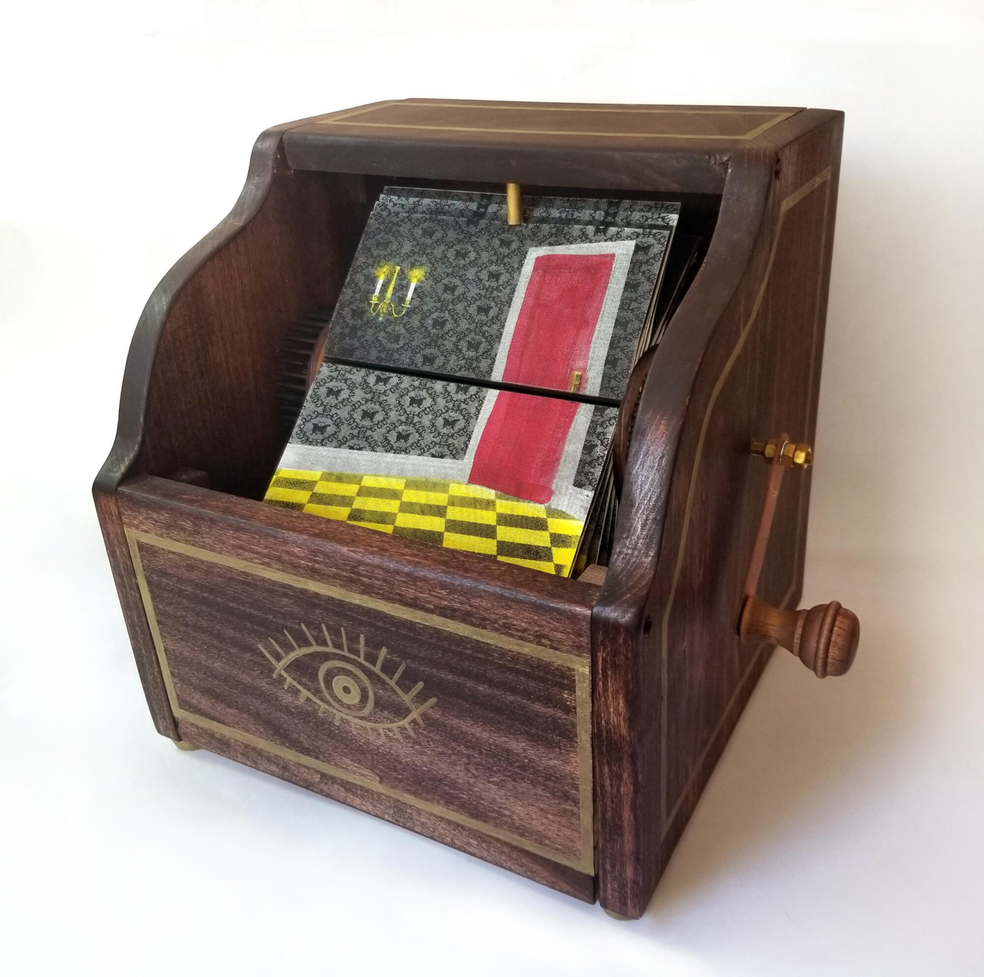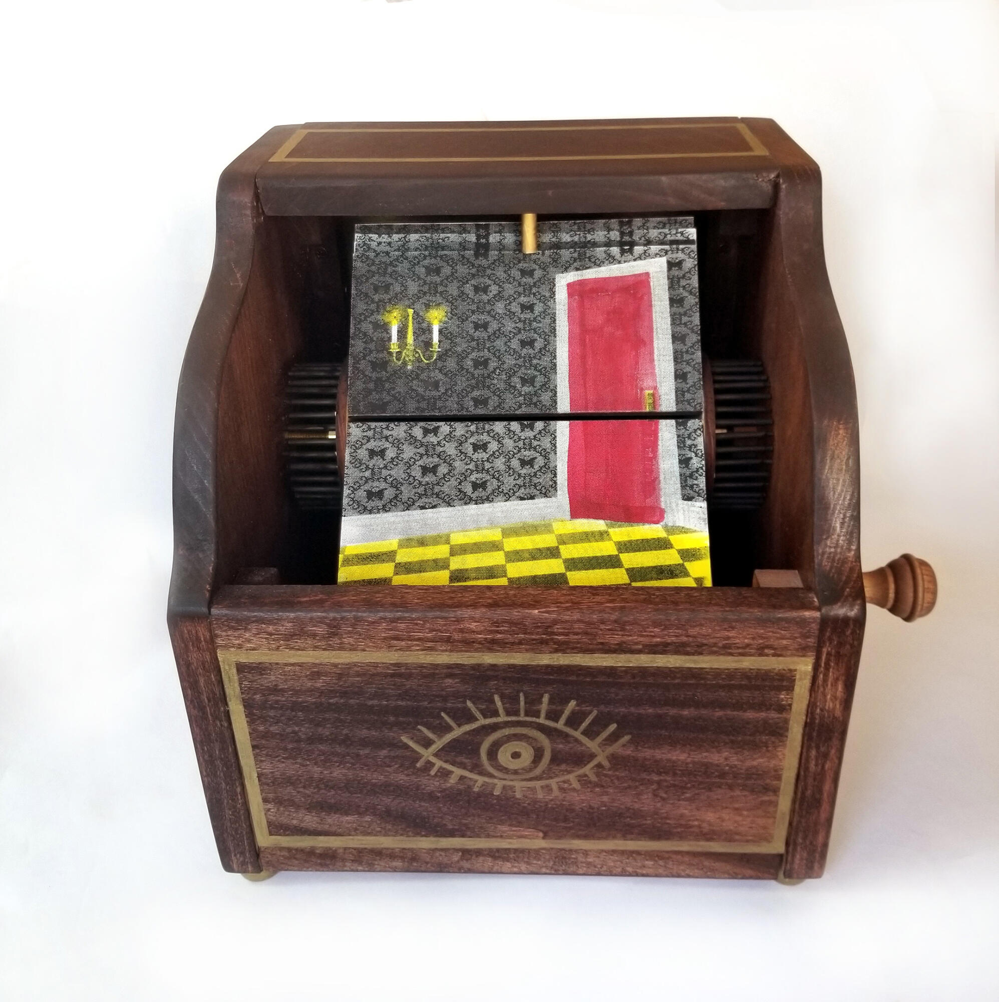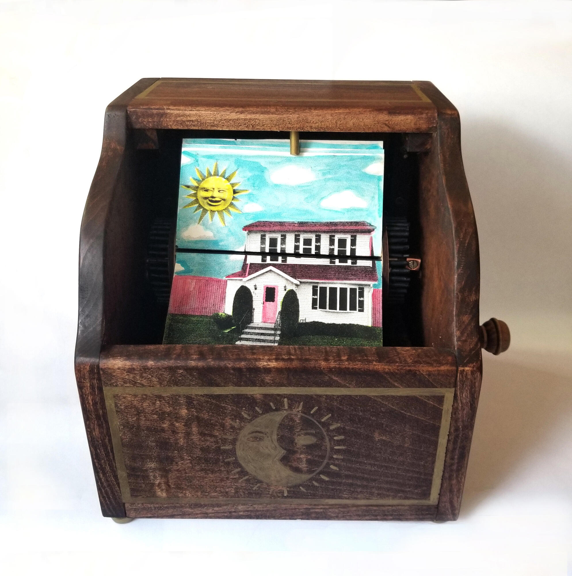 This series of mechanical flipbooks are hand built and interactive (2019). Each animation frame is hand painted and then silkscreened on top, making each animation one-of-a-kind. I drew inspiration from hand-painted films of the silent era as well as personal memories of my childhood home.