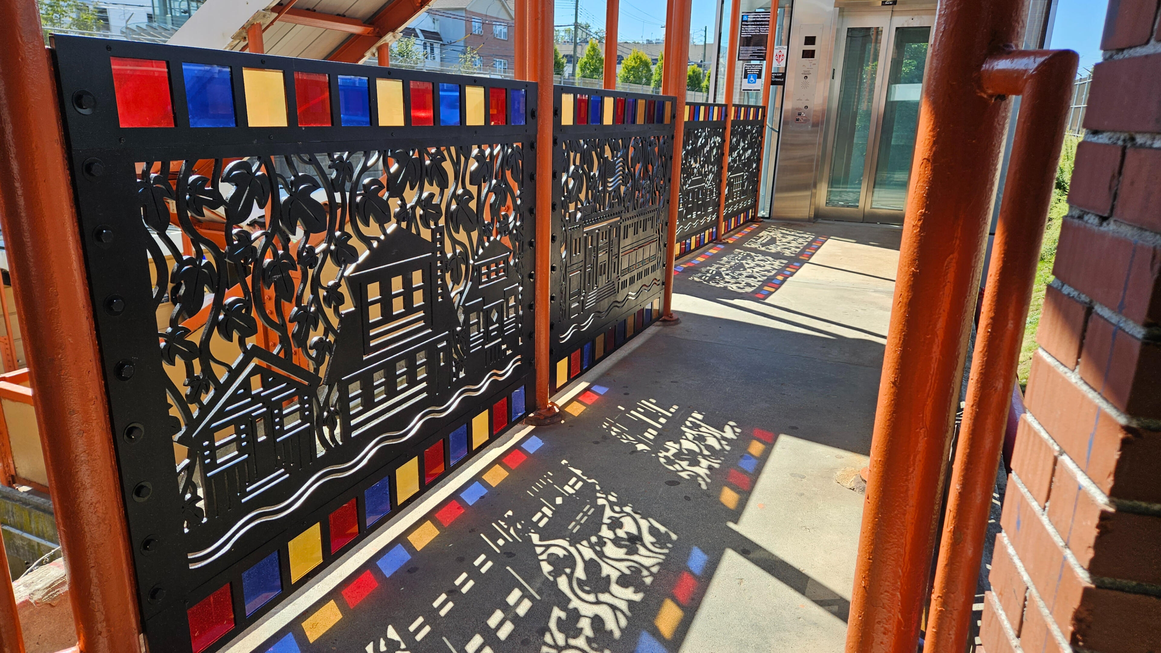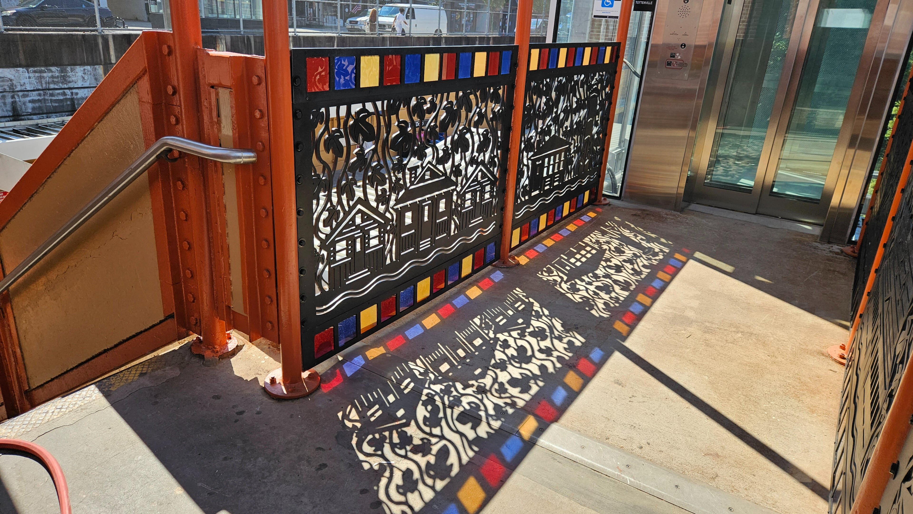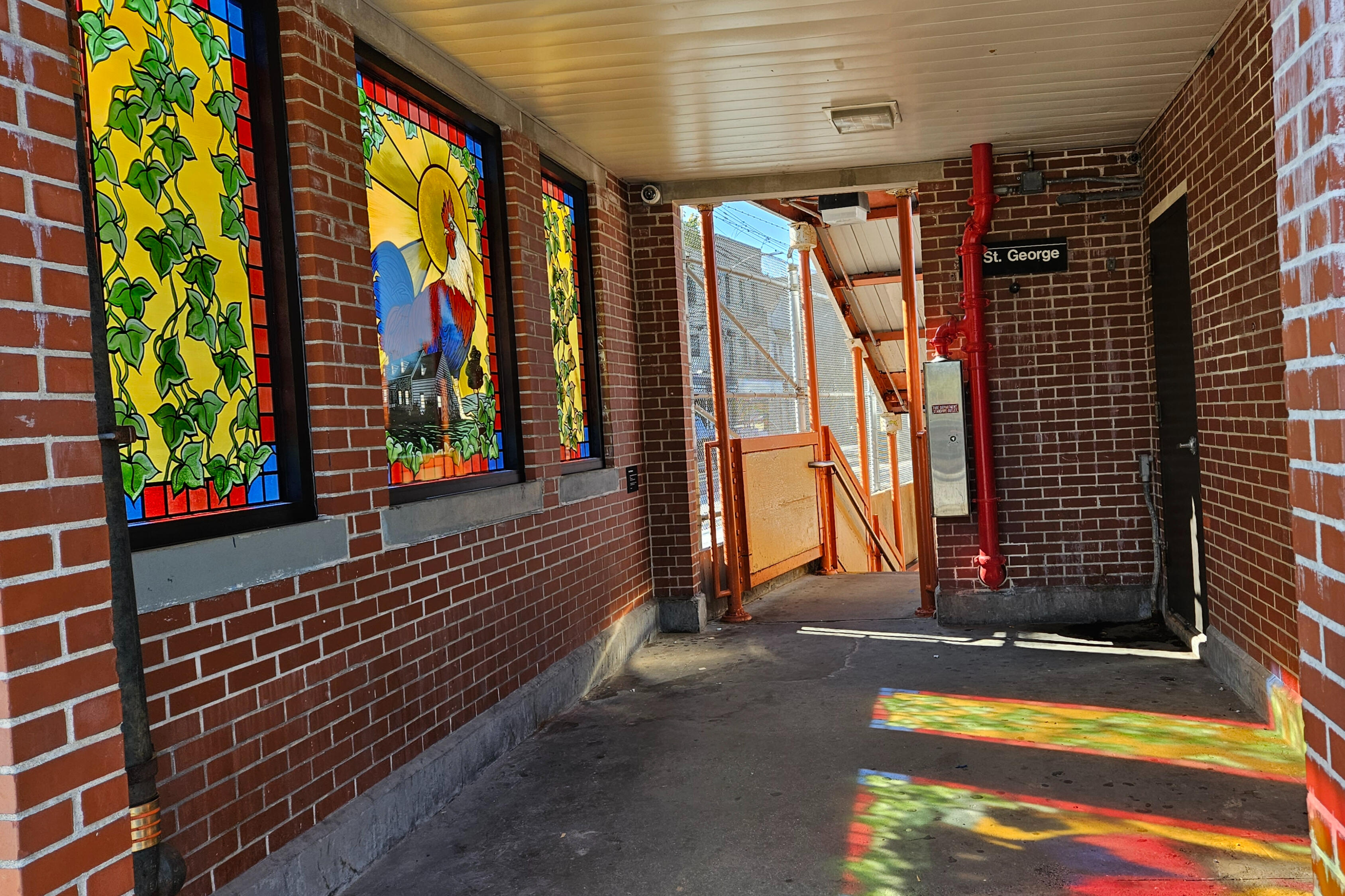 Creeping On Where Time Has Been is an appreciation of the borough’s historical architecture and includes imagery of notable structures such as the Vanderbilt Mausoleum and New Dorp Beach bungalows. I drew ideas from my research of the station area with the Historic Richmond Town Archive and New York Transit Museum Archive, as well as firsthand accounts from my mother who grew up in New Dorp. I went to high school near the station and currently reside nearby. My inspiration stems from the relationship between New Dorp's natural landscapes and architectural history in the neighborhood over the years. I wanted to create a work that draws attention to Staten Island’s rich history and give riders something beautiful and interesting to look at each day. The artwork title, a line from the poem The Ivy Green by Charles Dickens, is an allusion to the ivy motif that symbolizes the persistence of time and nature’s substantial presence on Staten Island despite manmade developments. Nine cut metal panels line the walkway to the new elevator on the Tottenville-bound side of the station and features blue, yellow, and red glass squares lining the top and bottom of the panels. The colorful border is also seen on the laminated glass panels of the station porticoes and references the stained glass of the original 1889 station house, which was relocated to Historic Richmond Town in 1965. In the metal design, the ivy motif is a backdrop to stylized beach bungalows alluding to New Dorp’s past as a turn-of- the-twentieth-century beach resort destination. The bungalow representations are based on on historic buildings such as the Lang's Hotel, the Elm Tree Lighthouse, the Munger on the Beach Hotel, and the Cedar Grove Clubhouse. The St. George-bound side of the station portico features a towering rooster in a nod to the farmland that once stretched across the neighborhood and acts as a greeter for morning commuters. The rooster stands over Britton Cottage, originally on New Dorp Lane, which was home to famous botanist Nathanial Lord Britton, founder of the New York Botanical Garden. It is one of the oldest structures on Staten Island and was also moved to Historic Richmond town. On the Tottenville-bound side is a serene evening scene for commuters returning home. A deer, common on Staten Island, stands over an illustration of the Vanderbilt Mausoleum located in nearby Moravian Cemetery. Cornelius Vanderbilt owned the New York Central Railroad and one of the first ferry services from Staten Island to Manhattan, indelible contributions to the daily commute of Staten Islanders.