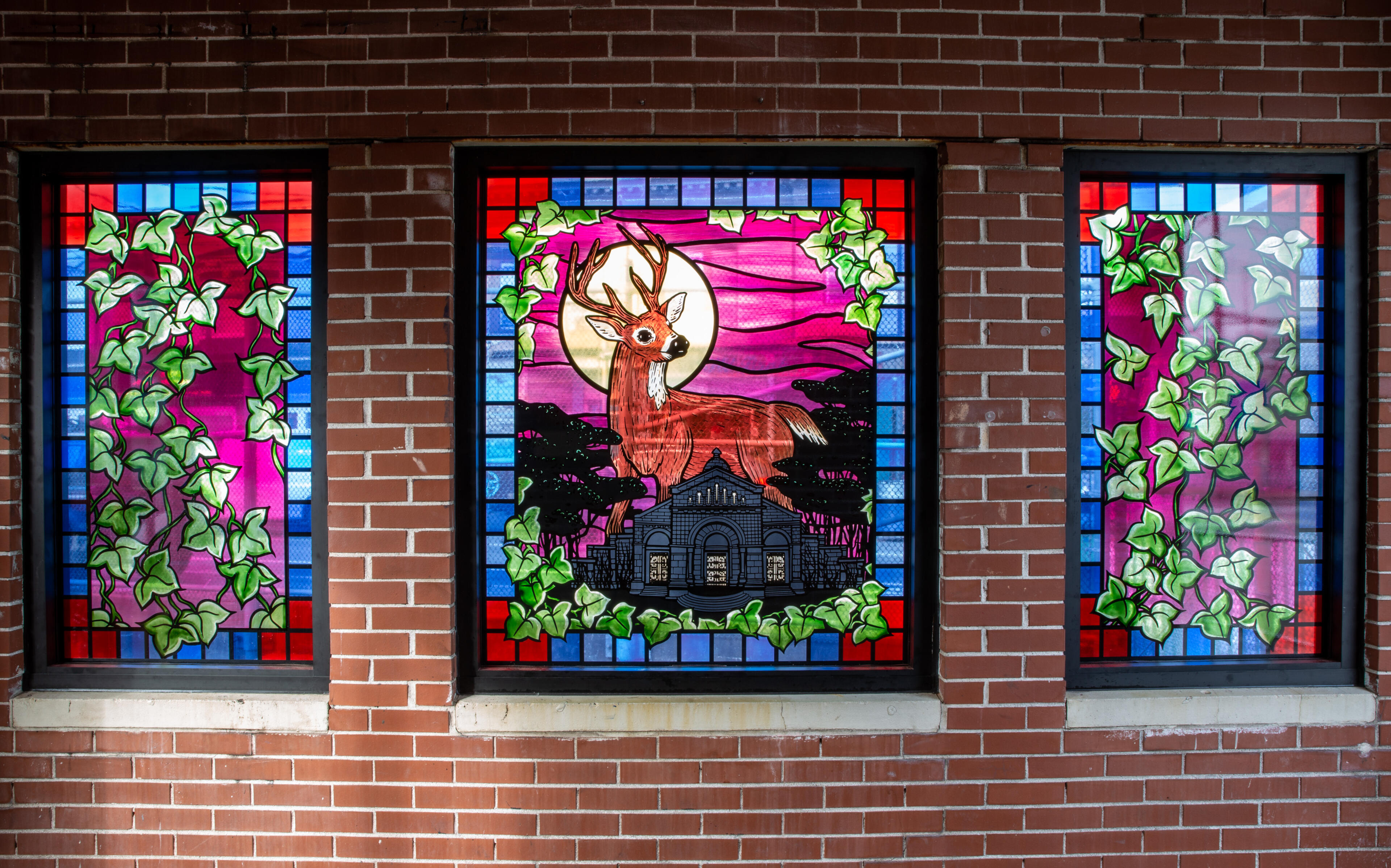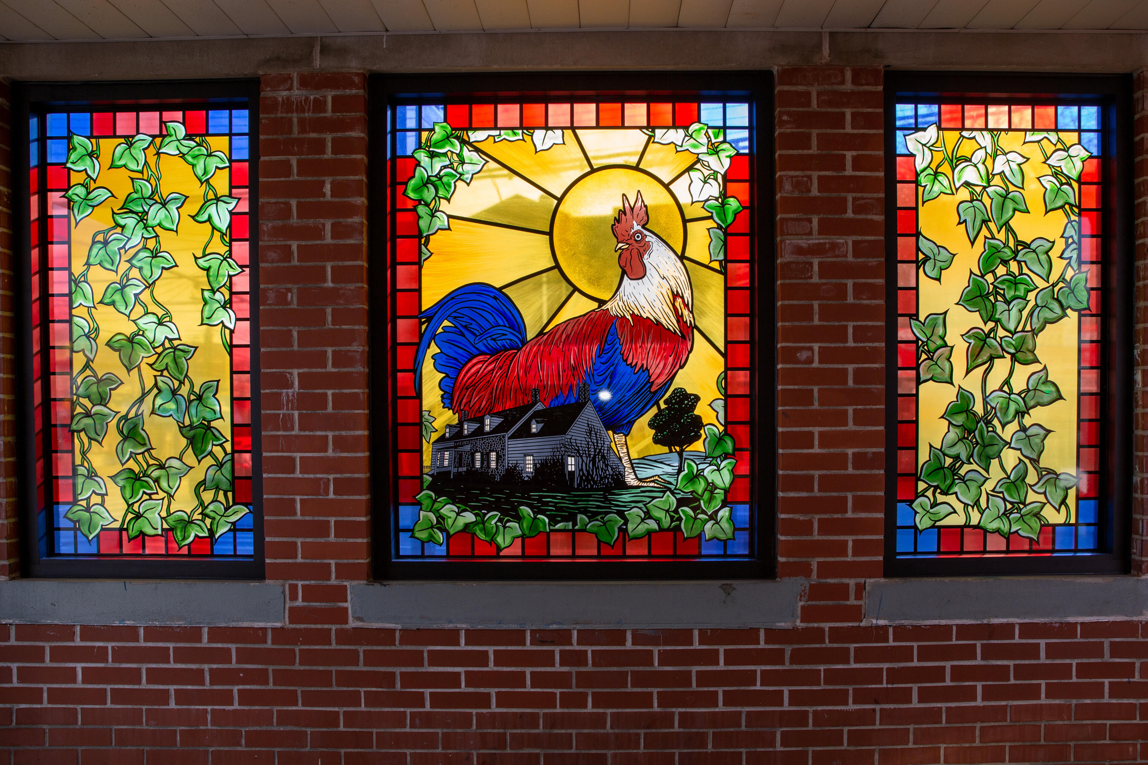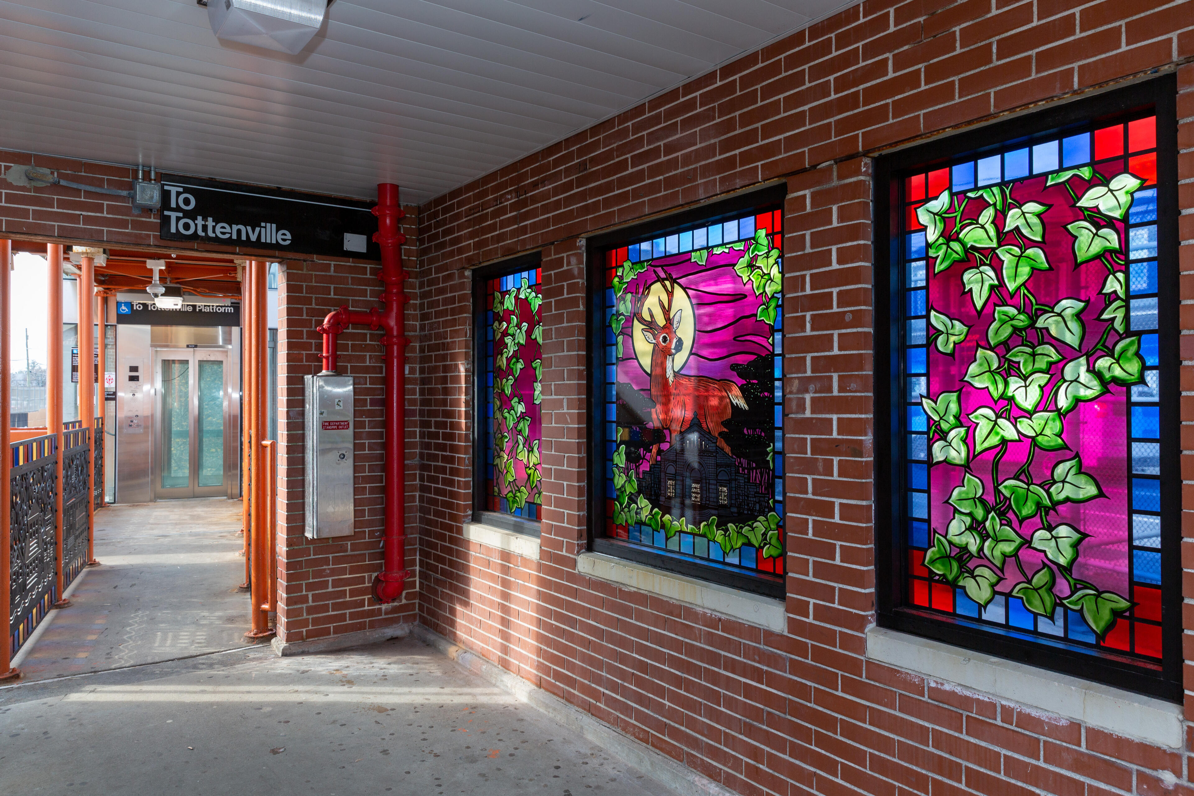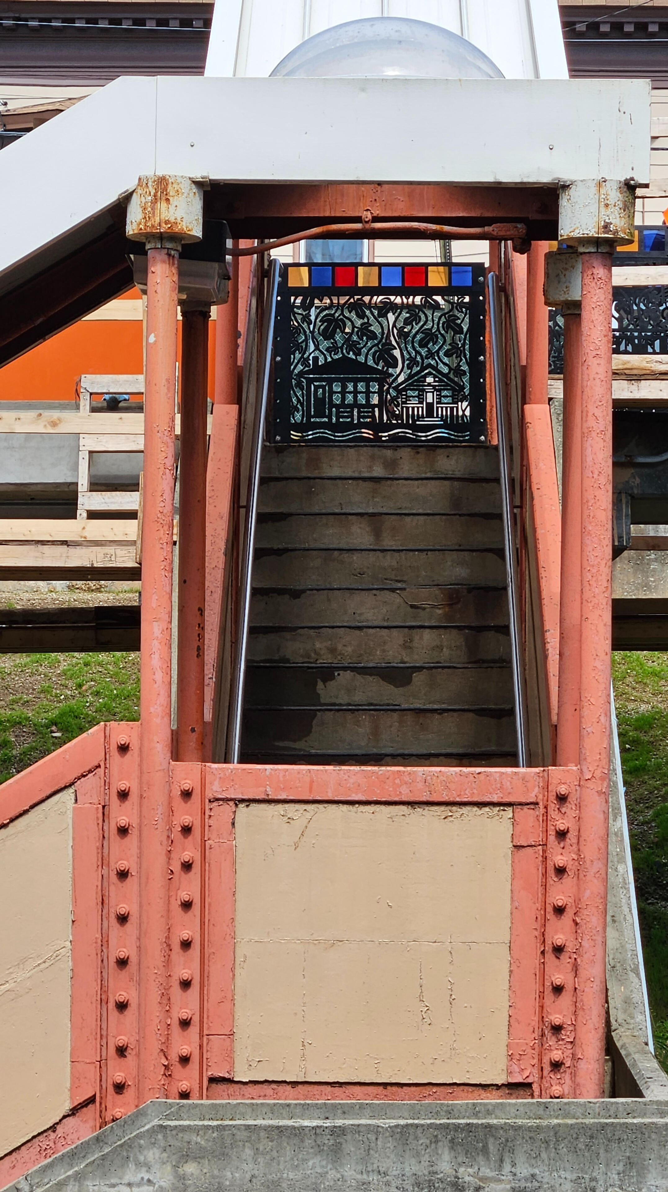 Creeping On Where Time Has Been is an appreciation of the borough’s historical architecture and includes imagery of notable structures such as the Vanderbilt Mausoleum and New Dorp Beach bungalows. I drew ideas from my research of the station area with the Historic Richmond Town Archive and New York Transit Museum Archive, as well as firsthand accounts from my mother who grew up in New Dorp. I went to high school near the station and currently reside nearby. My inspiration stems from the relationship between New Dorp's natural landscapes and architectural history in the neighborhood over the years. I wanted to create a work that draws attention to Staten Island’s rich history and give riders something beautiful and interesting to look at each day. The artwork title, a line from the poem The Ivy Green by Charles Dickens, is an allusion to the ivy motif that symbolizes the persistence of time and nature’s substantial presence on Staten Island despite manmade developments. Nine cut metal panels line the walkway to the new elevator on the Tottenville-bound side of the station and features blue, yellow, and red glass squares lining the top and bottom of the panels. The colorful border is also seen on the laminated glass panels of the station porticoes and references the stained glass of the original 1889 station house, which was relocated to Historic Richmond Town in 1965. In the metal design, the ivy motif is a backdrop to stylized beach bungalows alluding to New Dorp’s past as a turn-of- the-twentieth-century beach resort destination. The bungalow representations are based on on historic buildings such as the Lang's Hotel, the Elm Tree Lighthouse, the Munger on the Beach Hotel, and the Cedar Grove Clubhouse. The St. George-bound side of the station portico features a towering rooster in a nod to the farmland that once stretched across the neighborhood and acts as a greeter for morning commuters. The rooster stands over Britton Cottage, originally on New Dorp Lane, which was home to famous botanist Nathanial Lord Britton, founder of the New York Botanical Garden. It is one of the oldest structures on Staten Island and was also moved to Historic Richmond town. On the Tottenville-bound side is a serene evening scene for commuters returning home. A deer, common on Staten Island, stands over an illustration of the Vanderbilt Mausoleum located in nearby Moravian Cemetery. Cornelius Vanderbilt owned the New York Central Railroad and one of the first ferry services from Staten Island to Manhattan, indelible contributions to the daily commute of Staten Islanders.